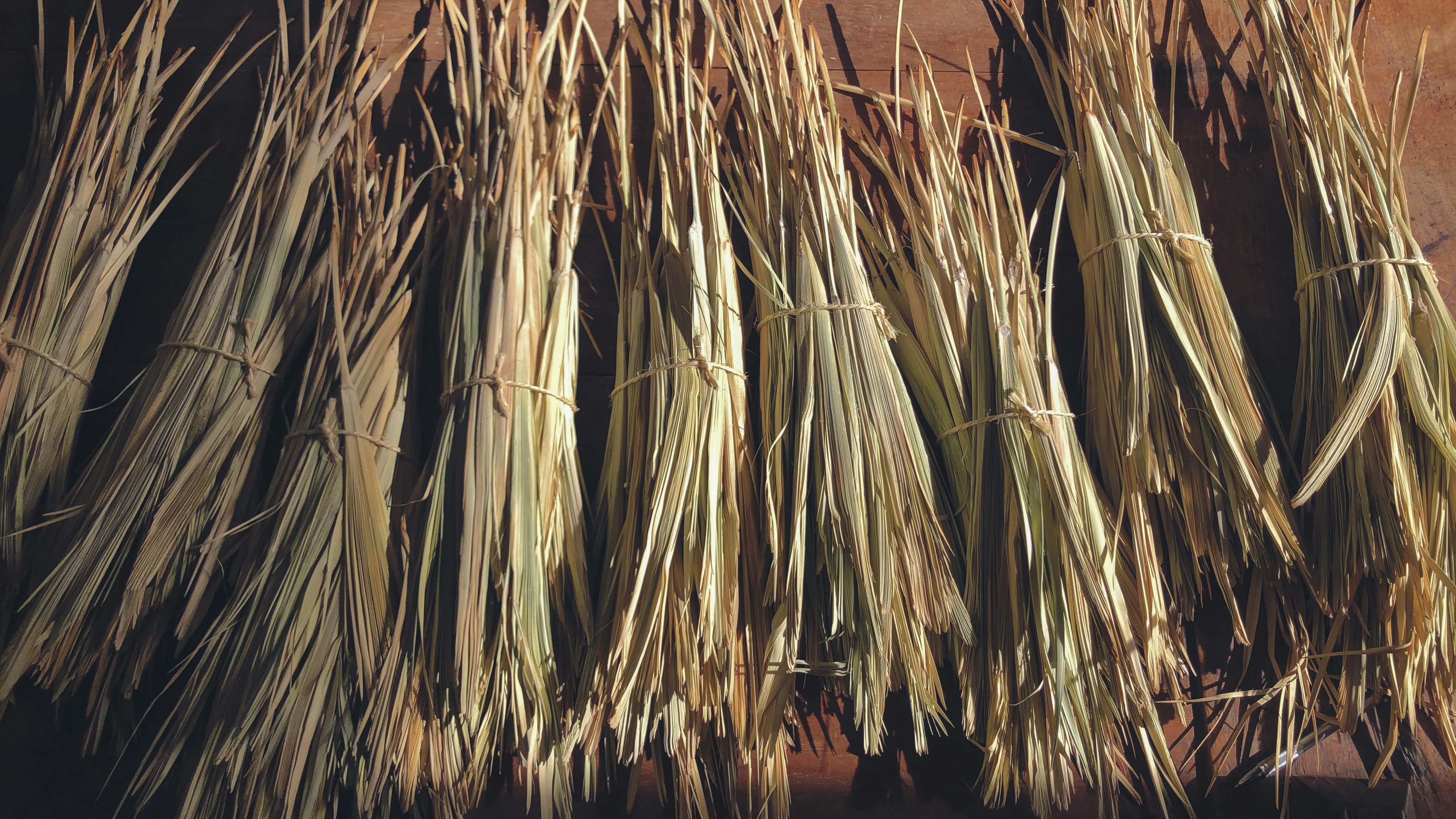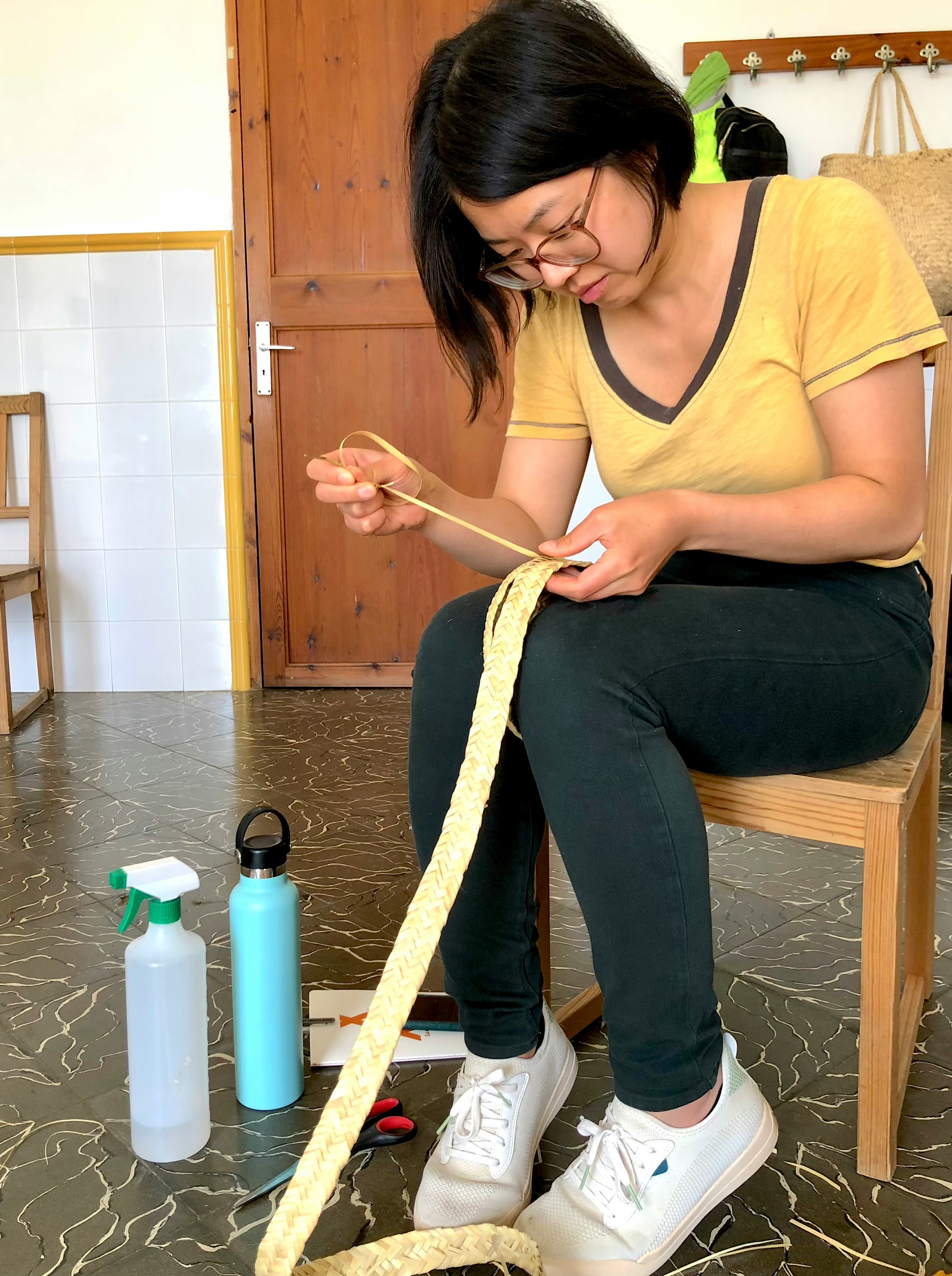 - Preparing the palm leaves to make a little bag or basket at the atelier in the countryside.