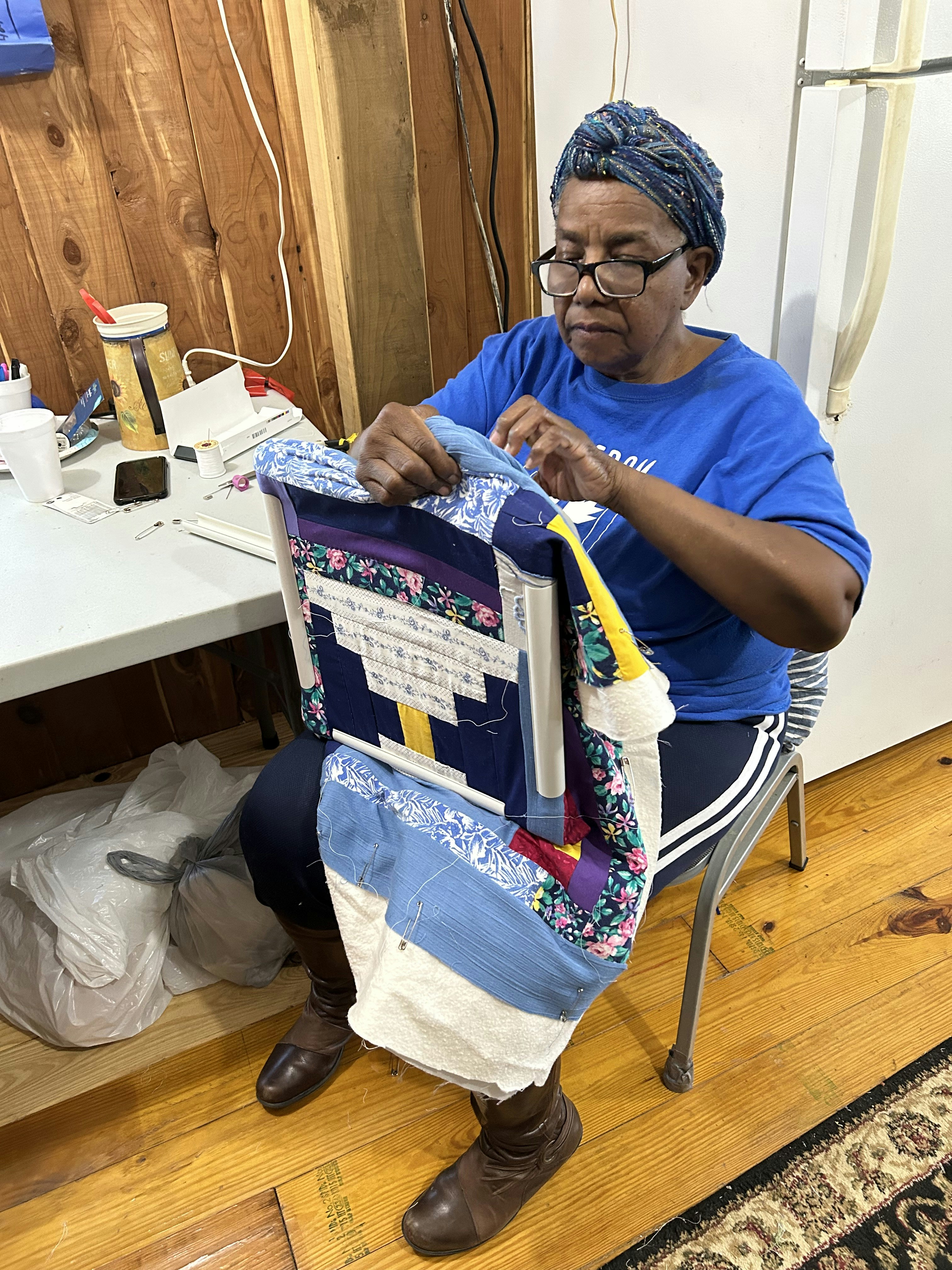 Marlene, Loretta’s sister-in-law, also grew up learning the Gee’s Bend quilting tradition from her mother and other family members. When her parents passed away, Marlene made 21 quilts out of their clothing, which provided comfort to her and her siblings.